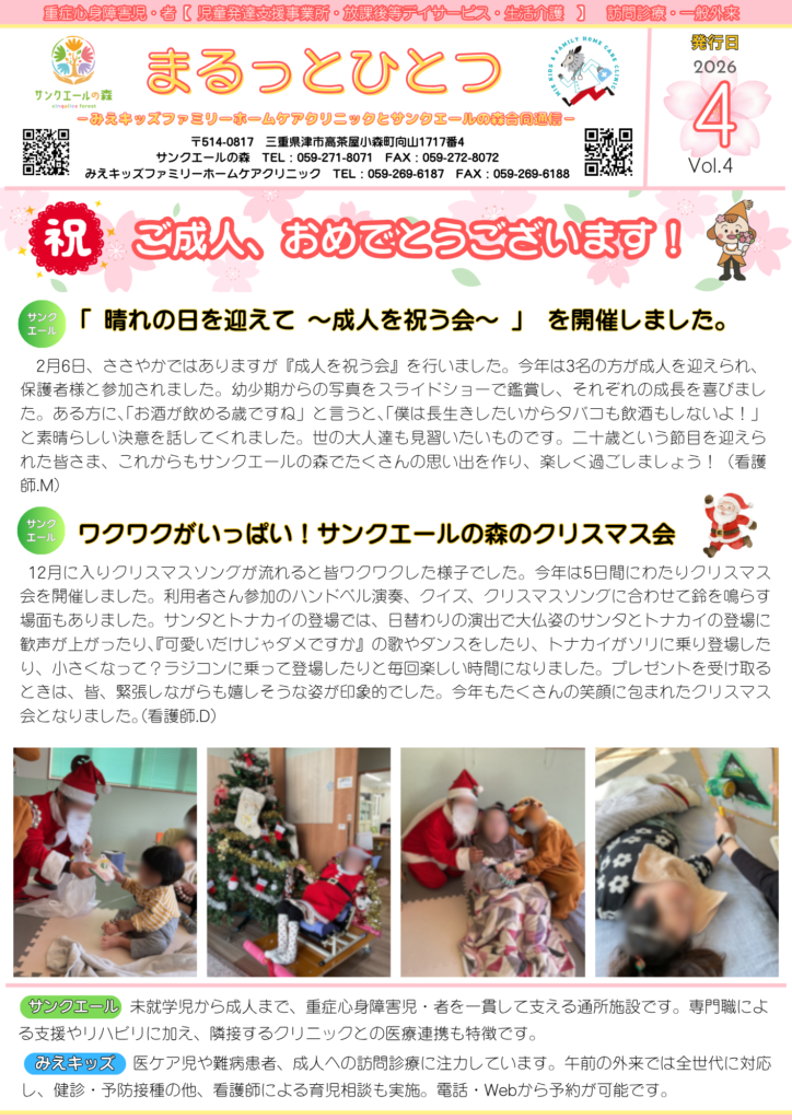 広報誌「まるっとひとつ」今年度第1号発行しました。クリスマス、成人を祝う会などの行事の紹介やみえキッズに新しい先生をお迎えしたことなどを掲載しています。ボランティアさんも募集していますので、ご興味のある方はご連絡ください。